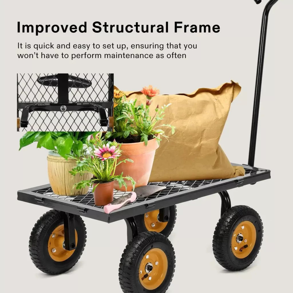 Ez a strapabíró kerti kocsi tökéletes választás minden ház körüli munkához, legyen szó kertészkedésről, szállításról vagy barkácsolásról. Erős acélvázzal és praktikus kialakítással készült, hogy hosszú éveken át megbízható társad legyen.