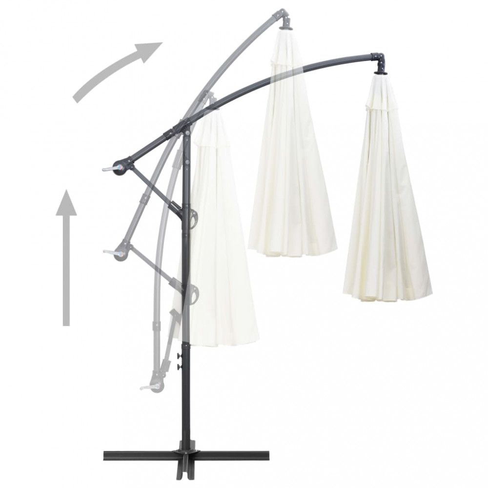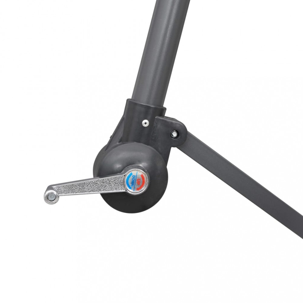 Ez a függő napernyő tökéletes megoldás arra, hogy árnyékot teremtsen, és megvédje a nap káros UV-sugaraival szemben. Az UV-sugárzás ellen védő, fakulásmentes poliészterből készült napernyőponyva optimális védelmet nyújt a nap sugaraival szemben, és könnyen tisztítható. A masszív kereszttalp stabillá teszi a napernyőt. Különleges kialakításának köszönhetően a napernyő extra nagy felületen nyújt védelmet a napsütés ellen. Az erős alumínium tartórúd és a 16 strapabíró borda rendkívüli stabilitást és tartósságot biztosít a napernyőnek. A tekerőkaros mechanizmusnak köszönhetően a kerti ernyő könnyen nyitható és csukható. A terméket könnyű összeszerelni. Kérjük, vegye figyelembe, hogy javasolt vízlepergető spray-vel befújni a napernyő szövetanyagát, ha az heves esőzéseknek van kitéve. Fontos, hogy minden olyan terméket, amelyet csavarok segítségével szereltek össze, két héttel az összeszerelés után újra meghúzzanak, és minden három hónapban egyszer - annak érdekében, hogy biztosítsák a termék stabilitását a teljes élettartama alatt. Ne húzza meg teljesen a csavarokat, amíg az összes csavar nincs megfelelően rögzítve. Tartsa távol a gyerekeket és háziállatokat az összeszerelési területtől az összeszerelés során. Bánjon óvatosan a nehéz alkatrészekkel. Győződjön meg róla, hogy a termék teljes mértékben össze van szerelve az ábrának megfelelően, mielőtt használatba veszi. Ezt a terméket csak szilárd, sík talajon szabad használni. Ügyeljen arra, hogy a terméket mindig sík talajon helyezze el. Nem vállalunk felelősséget a termék helytelen használatából eredő károkért vagy sérülésekért. Tartsa távol a kezét a hajtogatási mechanizmusoktól és mozgó alkatrészektől a lehetséges sérülések elkerülése érdekében. Soha ne használja vagy nyissa ki ezt az árnyékolót megfelelő alap nélkül. Ne használja ezt az árnyékolót erős szélben és esőben. Ennek elmulasztása személyi sérüléseket és/vagy károkat okozhat. Mindig zárja be az árnyékolót és tegye rá a takarót, ha a szél erősebb, mint egy „mérsékelt szellő”, ha hó esik, vagy ha esik az eső. A termék apró részeket tartalmaz, amelyek veszélyeztethetik a kisgyermekeket. Tartsa távol az apró részeket a gyermekektől. Ez a termék nem játék! Ügyeljen arra, hogy a gyermekek ne használják sem az árnyékolót, sem a napernyőt, sem az alapot játékra vagy mászásra. Ne használjon nyílt tüzet (pl. kerti grillező vagy sütő) közvetlenül a termék alatt vagy mellett.