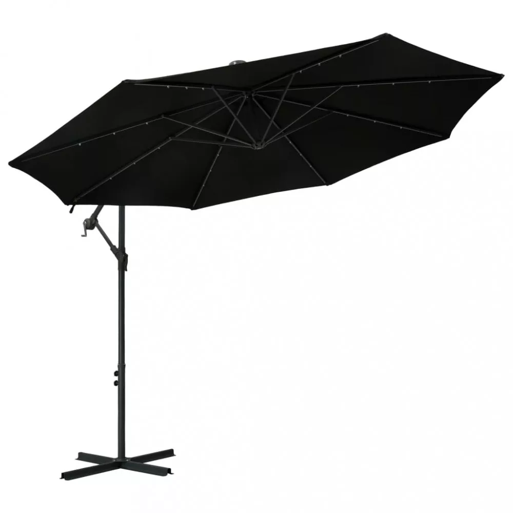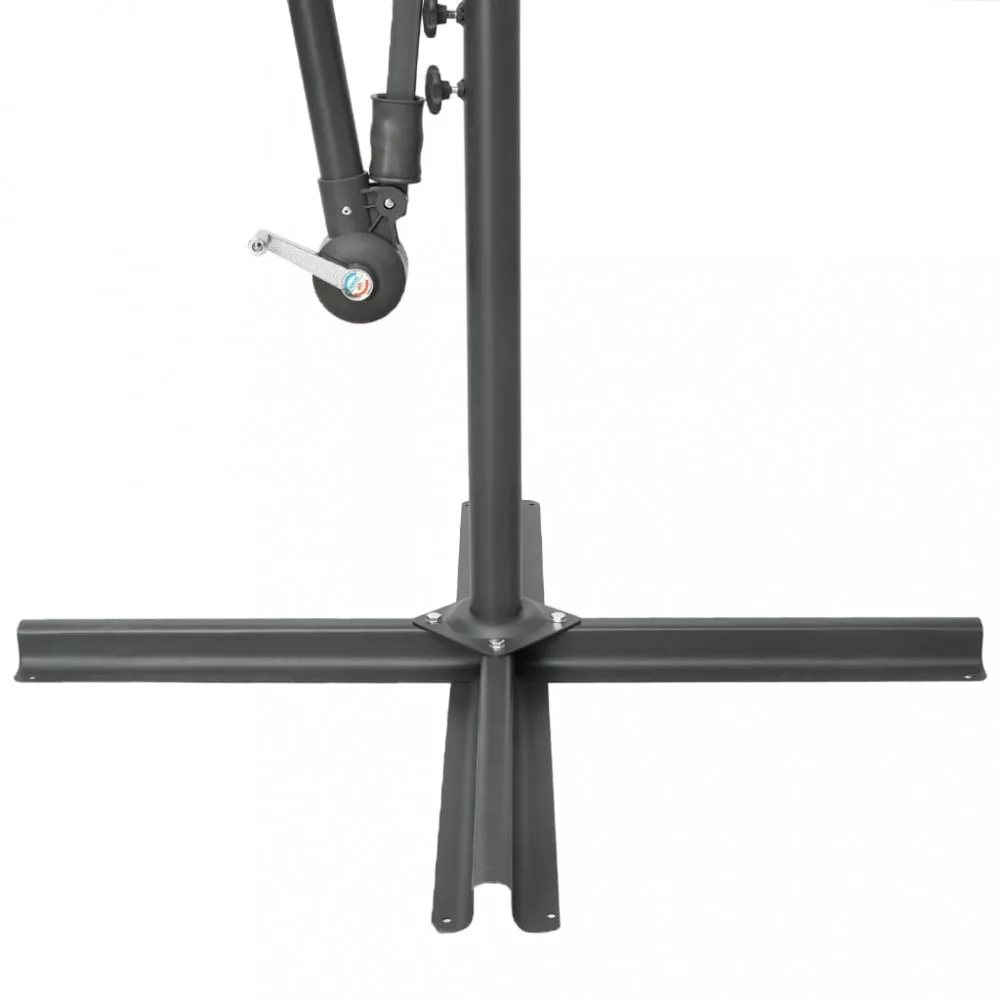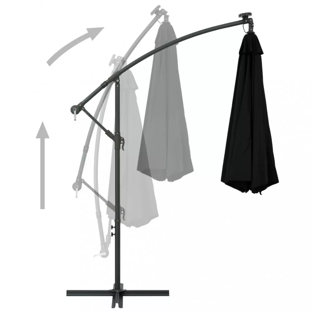 Ez az elegáns függő napernyő a LED-fényeivel tökéletes megoldás arra, hogy árnyékot teremtsen és megvédjen a nap káros UV sugárzásával szemben. Az UV-sugárzás ellen védő, fakulásmentes poliészterből készült napernyő-ponyva optimális védelmet nyújt a nap sugaraival szemben; tisztítása pedig egyszerű. 24 db napelemes LED-lámpája naplemente után automatikus felkapcsol és megvilágítja az ernyő környezetét, meghitt és romantikus hangulatot teremtve. Stabillá teszi a napernyőt a masszív kereszttalp. Különleges kialakításának köszönhetően a napernyő dönthető, így folyamatosan takarást biztosít a délután során a horizont felé ereszkedő nap elől. Az erős acél tartórúd és a 8 strapabíró borda rendkívüli stabilitást és szilárdságot biztosít a napernyőnek. A tekerőkaros mechanizmusnak hála a kerti ernyő könnyen kinyitható és becsukható. A termék összeszerelése egyszerű. Kérjük, vegye figyelembe, hogy javasolt impregnáló spray-vel befújni a napernyő szövetanyagát, ha az heves esőzéseknek is ki lehet téve. Fontos, hogy minden olyan terméket, amelyet csavarok segítségével szereltek össze, két héttel az összeszerelés után újra meghúzzanak, és minden három hónapban egyszer - annak érdekében, hogy biztosítsák a termék stabilitását a teljes élettartama alatt. Ne húzza meg teljesen a csavarokat, amíg az összes csavar nincs megfelelően rögzítve. Tartsa távol a gyerekeket és háziállatokat az összeszerelési területtől az összeszerelés során. Bánjon óvatosan a nehéz alkatrészekkel. Győződjön meg róla, hogy a termék teljes mértékben össze van szerelve az ábrának megfelelően, mielőtt használatba veszi. Ezt a terméket csak szilárd, sík talajon szabad használni. Ügyeljen arra, hogy a terméket mindig sík talajon helyezze el. Nem vállalunk felelősséget a termék helytelen használatából eredő károkért vagy sérülésekért. Tartsa távol a kezét a hajtogatási mechanizmusoktól és mozgó alkatrészektől a lehetséges sérülések elkerülése érdekében. Soha ne használja vagy nyissa ki ezt az árnyékolót megfelelő alap nélkül. Ne használja ezt az árnyékolót erős szélben és esőben. Ennek elmulasztása személyi sérüléseket és/vagy károkat okozhat. Mindig zárja be az árnyékolót és tegye rá a takarót, ha a szél erősebb, mint egy „mérsékelt szellő”, ha hó esik, vagy ha esik az eső. A termék apró részeket tartalmaz, amelyek veszélyeztethetik a kisgyermekeket. Tartsa távol az apró részeket a gyermekektől. Ez a termék nem játék! Ügyeljen arra, hogy a gyermekek ne használják sem az árnyékolót, sem a napernyőt, sem az alapot játékra vagy mászásra. Ne használjon nyílt tüzet (pl. kerti grillező vagy sütő) közvetlenül a termék alatt vagy mellett. Ha a szélsebesség meghaladja a 6 m/s-t, vagy erős eső esetén, óvatosan távolítsa el a terméket, hajtsa össze, rögzítse, és helyezze biztonságos helyre. Ha a szövet váratlanul nedves lesz, azonnal szárítsa meg, hogy elkerülje a termék idő előtti öregedését. Használat előtt ellenőrizze, hogy a pavilon, sátor, napernyő vagy lugas nincs-e sérült állapotban (meggörbült fémelemek, szakadt szövet). Ha sérülést talál, ne használja a terméket. Ezeknek az irányelveknek a be nem tartása károsodáshoz vezethet.