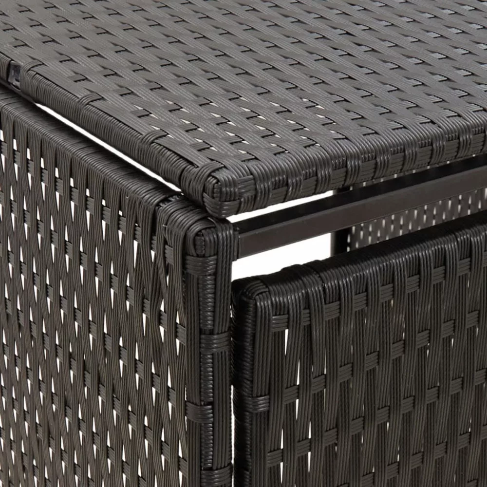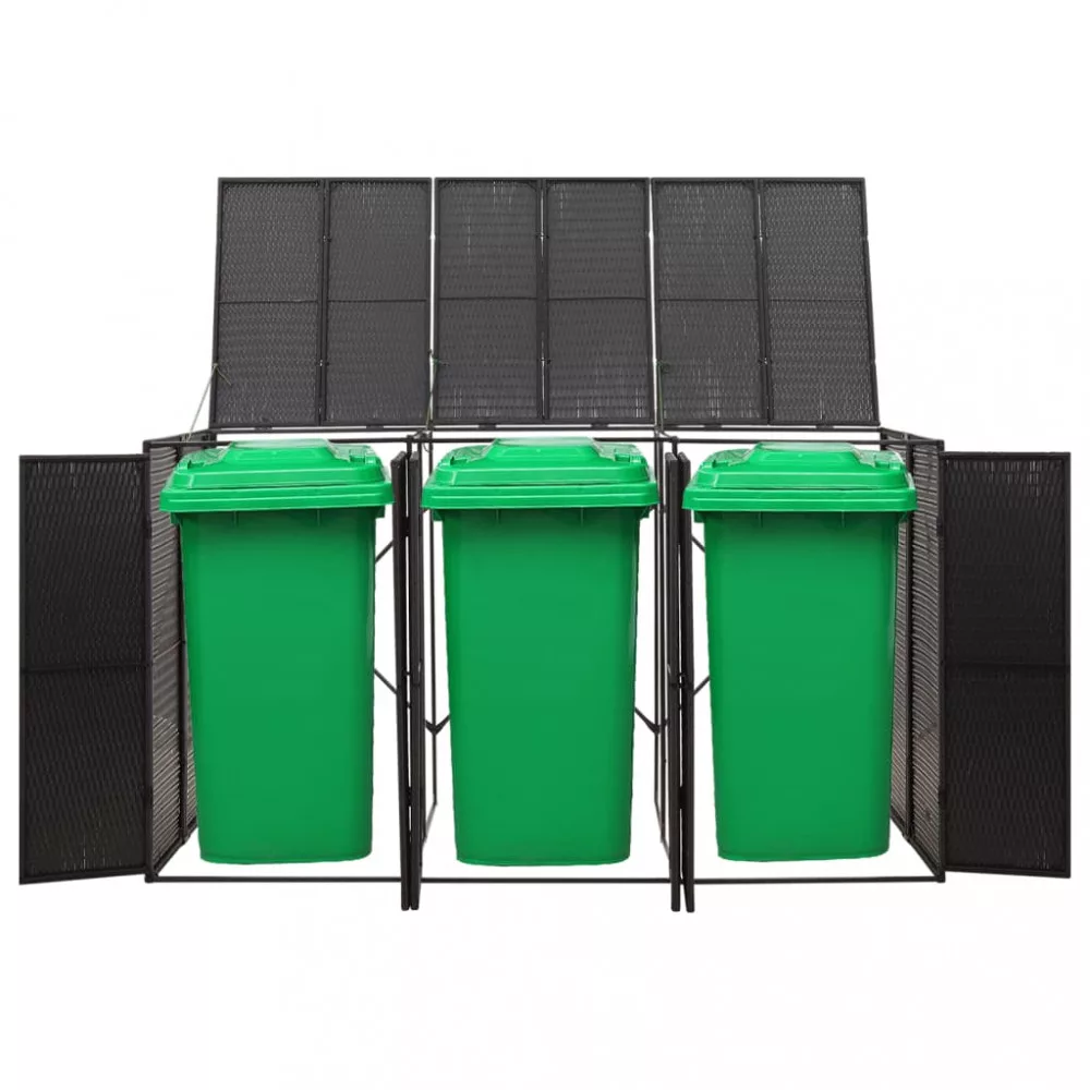 Ez a hármas kerekeskuka tárolófészer ideális arra, hogy elrejtse szem elől szemetes kukáját a kertben. Tartós anyag: A polirattan rendkívül ellenálló anyag, és különböző időjárási körülmények között is tartós. Kevés karbantartást igényel.Stabil váz: A porszórt acél váz erős szerkezetet és stabilitást biztosít.Praktikus kialakítás: Ennek a szemeteskuka tárolófészernek a fedele kinyitható, így a szemét elhelyezésekor könnyen hozzáférhet a kerekes szeméttárolóhoz. Elöl zárható ajtókkal is rendelkezik, így a szemetes könnyen eltávolítható és kiüríthető. Megjegyzés:Az egyszerű összeszerelés érdekében minden termékhez mellékelünk összeszerelési útmutatót.A kerekes szemetes nem része a szállítmánynak.