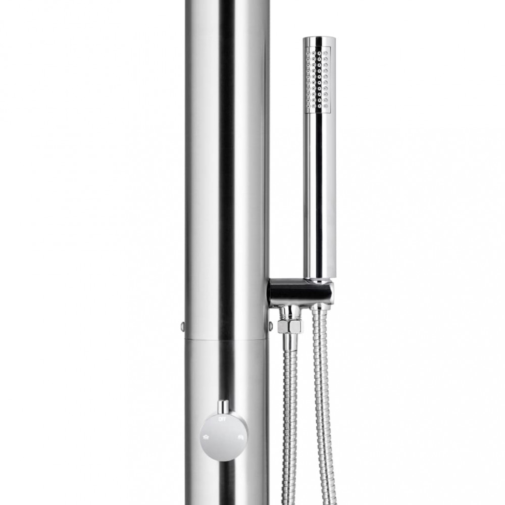 Ez a modern kialakítású kerti zuhany úszómedencéje vagy egyéb kültéri környezete nagyszerű kiegészítője lesz. A kültéri zuhany rozsdamentes acélból készült, így időjárásálló. A zuhanyrendszer vízesés funkcióval ellátott fejzuhannyal és kézizuhannyal rendelkezik, így a kertészeti, az öntözési és a gyors zuhanyozási igényeknek is megfelel. A kézizuhany 1,5 m hosszú, dupla zárral ellátott rugalmas tömlővel rendelkezik. Réz kézizuhany-tartóval is fel van szerelve. Kényeztesse magát egy pihentető zuhanyzással, és élvezze a kültéri zuhanyrendszer modern stílusát!