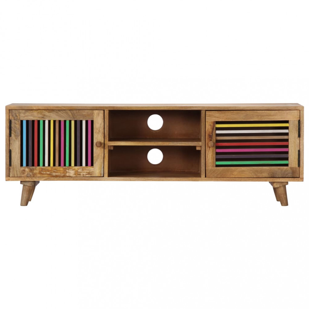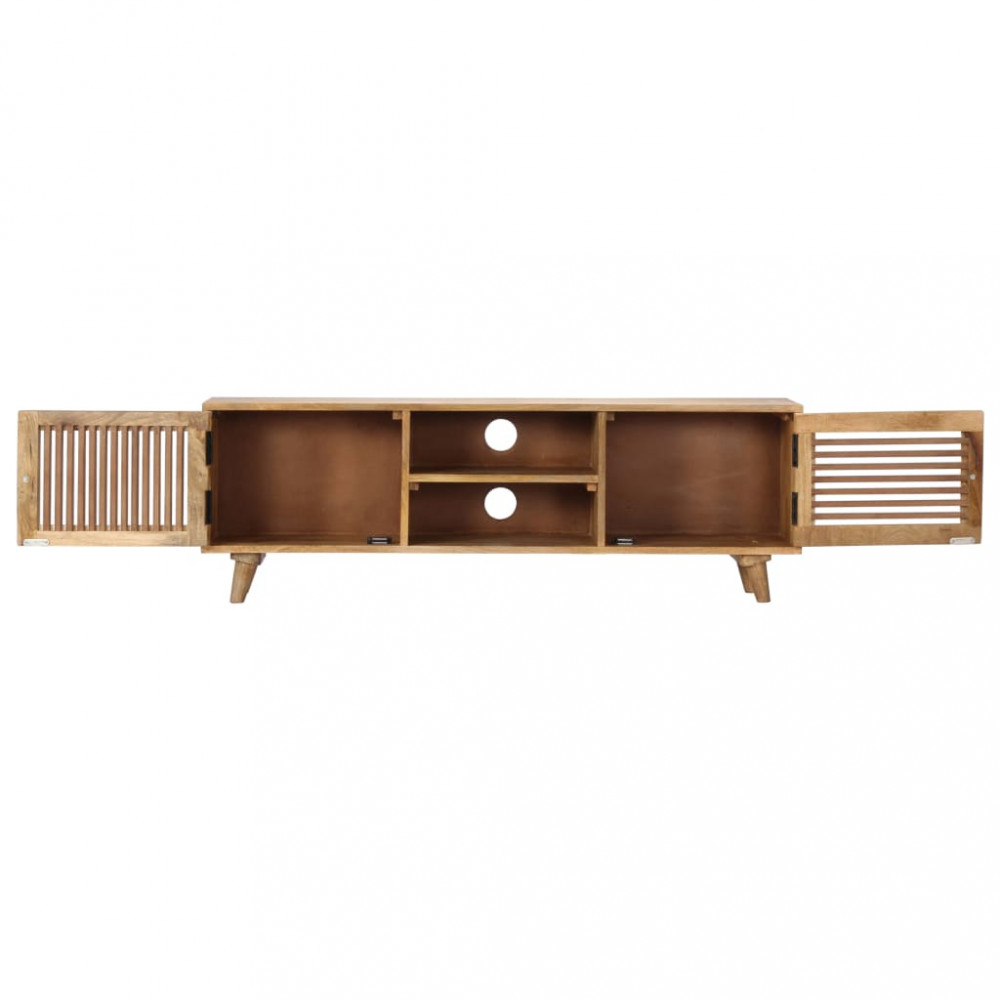 Ez a fából készült TV-szekrény otthona szemet gyönyörködtető kiegészítője lesz. A HiFi-szekrény tömör mangófából, egy sűrű erezetű keményfából készült. A nyers mangófa nemcsak a ránehezedő súlyt bírja el, de időtálló is. Ez a gyönyörű kialakítású szekrény stabil, tartós és szemet gyönyörködtető. Ez a sztereó szekrény teljes mértékben kézzel készült, és az esztétikus faerezet minden bútordarabot egyedivé és kissé eltérővé varázsol. Ez a komód 1 fiókkal, 2 rekesszel és 2 ajtós szekrénnyel rendelkezik, amelyek bőséges helyet biztosítanak multimédiás készülékei, könyvei és számos egyéb tárgy tárolására. Fontos megjegyzés: A szín minden darab esetében eltérő, így minden bútor egyedi. A kiszállítás véletlenszerűen történik, biztosítva terméke exkluzivitását és egyediségét.
