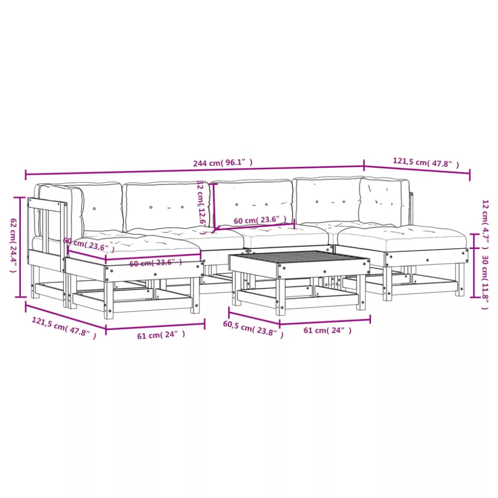 - Középső kanapé mérete: 61 x 61 x 62 cm (Ho x Szé x Ma)