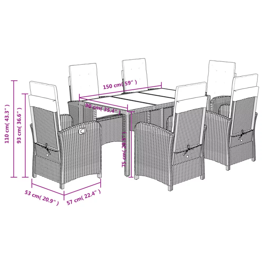 - Anyaga: polietilén rattan, porszórt acélváz, edzett üveg