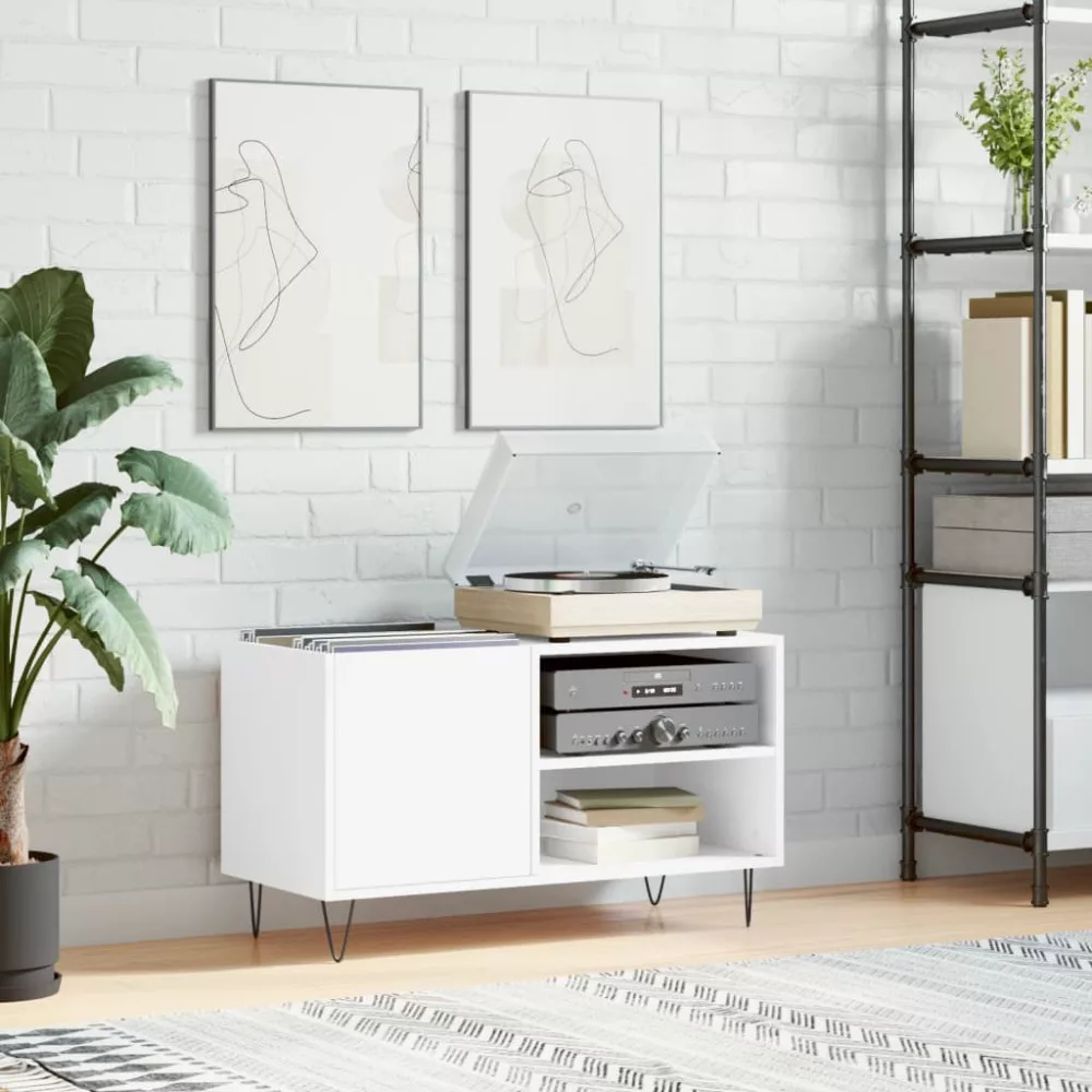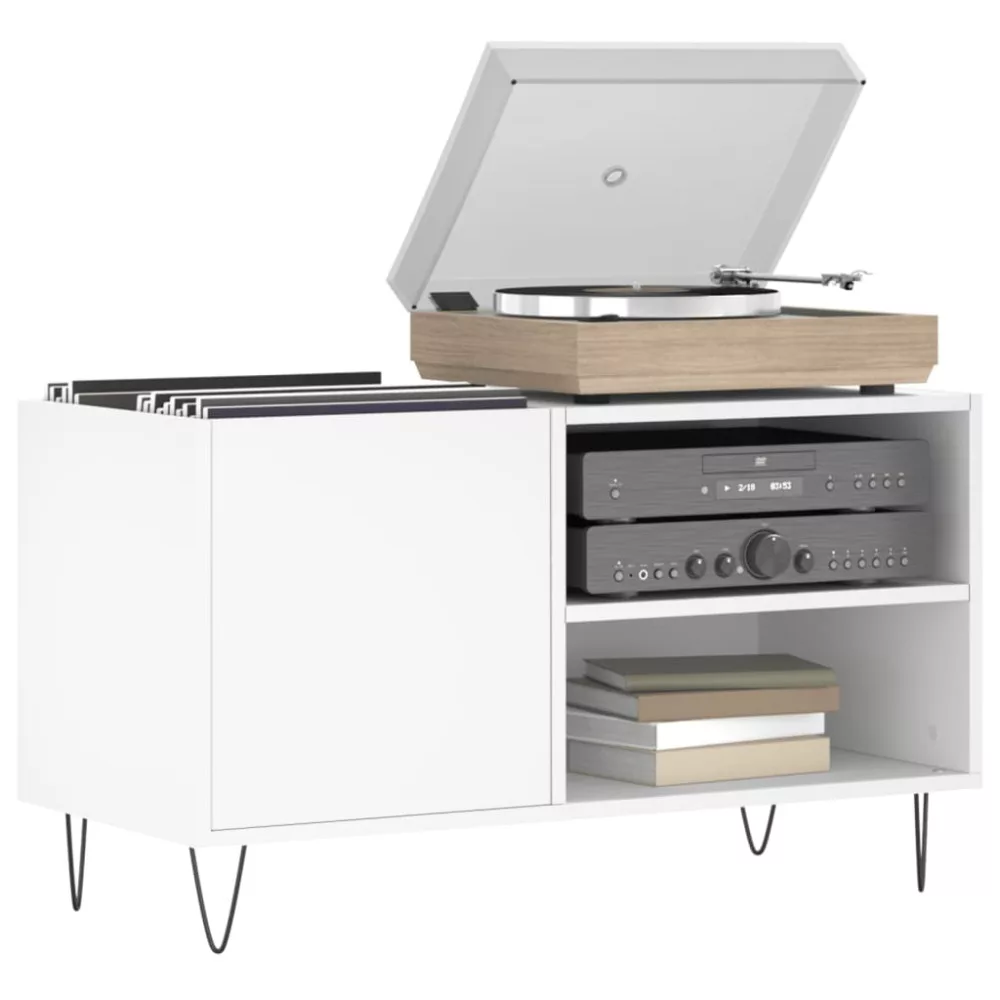 Tárolja és mutassa be bakelitlemezeit ezzel a praktikus és klasszikus hanglemezszekrénnyel! Tartós anyag: A szerelt fa kivételes minőségű, sima felületű, szilárd, stabil, és ellenáll a nedvességnek.Bőséges tárolóhely: Ez a tágas lemezjátszószekrény bőséges tárolóhelyet kínál nagylemezei számára, valamint rendben tartja zenegyűjteményét.Erős felső lap: A bakelittároló szekrény ideális lemezjátszója és egyéb elektronikai eszközei számára.Vaslábak: A vaslábak ipari stílust csempésznek otthonába, és a stabilitásról is gondoskodnak.