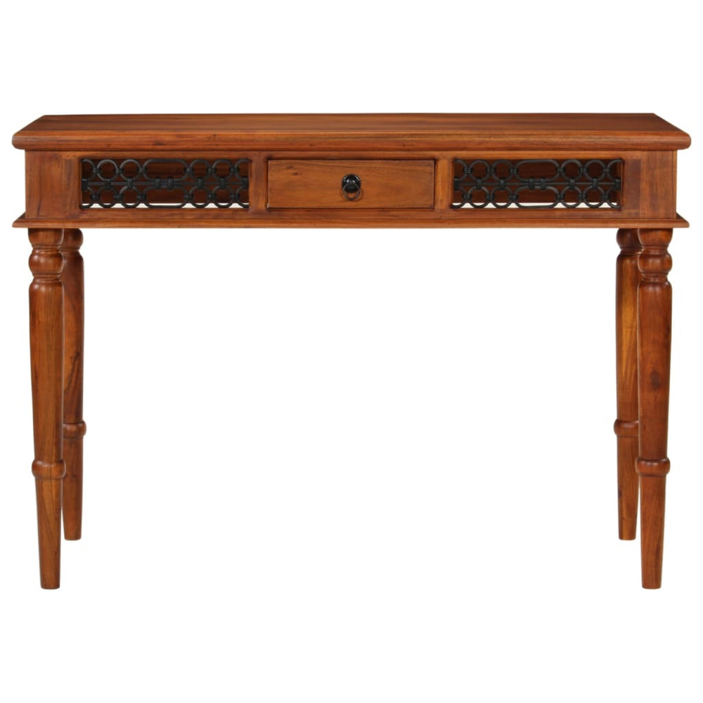 Ez az antik dizájnú fa íróasztal nagyszerű kiegészítője lesz nappalijának. Tömör akácfa: Ez az irodai asztal tömör akácfából készült, mézszínű bevonattal. Az akácfa egy gyönyörű természetes anyag. Ez egy trópusi keményfa, amely sűrű erezetű, stabil és tartós.Bőséges hely: A dolgozóasztal masszív teteje ideális számítógép, könyvek vagy dekorációs tárgyak, például vázák vagy cserepes növények elhelyezésére. A fiók ideális különféle apró tárgyak rendezett és elérhető helyen tartására.Fém fogantyú és díszítések: A munkaasztal fém fogantyúval rendelkezik, amely megkönnyíti a fiók nyitását és csukását. Ezenkívül az oldalsó fémdíszek fokozzák az íróasztal esztétikai megjelenését.Könnyen tisztítható felület: Az irodai asztal nedves ruhával könnyen tisztítható. Jó tudni:Minden termék egyedi, a szín és az erezet változik. A kiszállítás véletlenszerűen történik, biztosítva terméke exkluzivitását és egyediségét.