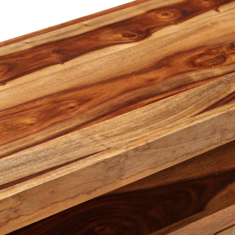 Ez a gyönyörű akácfából készült TV-szekrény nemcsak divatos, hanem praktikus is, és garantáltan szobája középpontja lesz. Ez a vintage stílusú TV-szekrény tömör akácfából készült, így időtlen kiegészítője lesz otthonának. Az akácia, más néven kelet-indiai rózsafa vagy paliszander, egy trópusi keményfa, mely gazdag erezetéről ismert. A megmunkálás minden lépése a legnagyobb gondossággal történt, legyen szó akár a csiszolásról, a festésről vagy a lakkozásról. Az erős acélkeretnek köszönhetően a TV állvány rendkívül stabil és tartós. Két fiókkal rendelkezik apró tárgyak tárolására és egy polccal ahol multimédiás berendezéseit, könyveit, magazinjait és egyéb holmijait tárolhatja. A TV-állvány tárolószekrényként, hi-fi szekrényként stb. is használható. Figyelem: A szín minden darab esetében más, így ezek a TV szekrények mind egyediek. A kiszállítás véletlenszerűen történik, biztosítva terméke exkluzivitását és egyediségét.