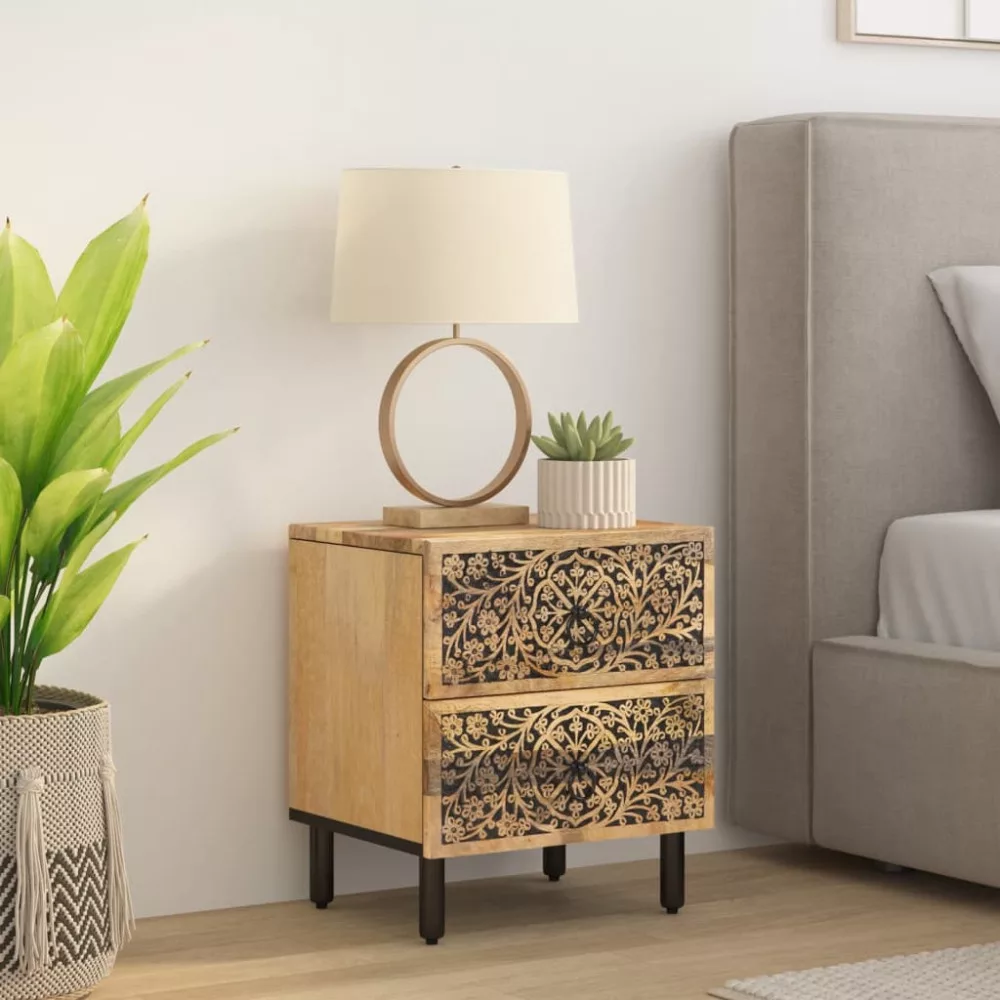 Ez az elegáns kialakítású éjjeliszekrény otthona időtálló kiegészítője. Tömör mangófa: A tömör mangófa egy erős, trópusi keményfa, melyből strapabíró bútorok készíthetőek. A fa gyönyörű erezetének köszönhetően minden darab kissé különbözik a többitől. A tömör mangófából készült szekrény rendkívül tartós és stabil.Bőséges tárolóhely: Az éjjeliszekrény 2 fiókkal lett ellátva holmijai elérhető közelségben történő rendezett tárolásához.Stabil asztallap: A kisszekrény teteje tökéletes dísztárgyak, képkeretek és cserepes növények elhelyezésére.Erős lábak: Ennek a hálószobabútornak a vaslábai robusztusságot és a stabilitást biztosítanak.Retro stílus: Ez a kézzel faragott virágmintákkal díszített éjjeliszekrény a retro stílus luxusát viszi otthonába, így garantáltan a szoba központi eleme lesz. Jó tudni:Minden termék egyedi, a szín és az erezet változik. A kiszállítás véletlenszerűen történik, biztosítva terméke exkluzivitását és egyediségét.